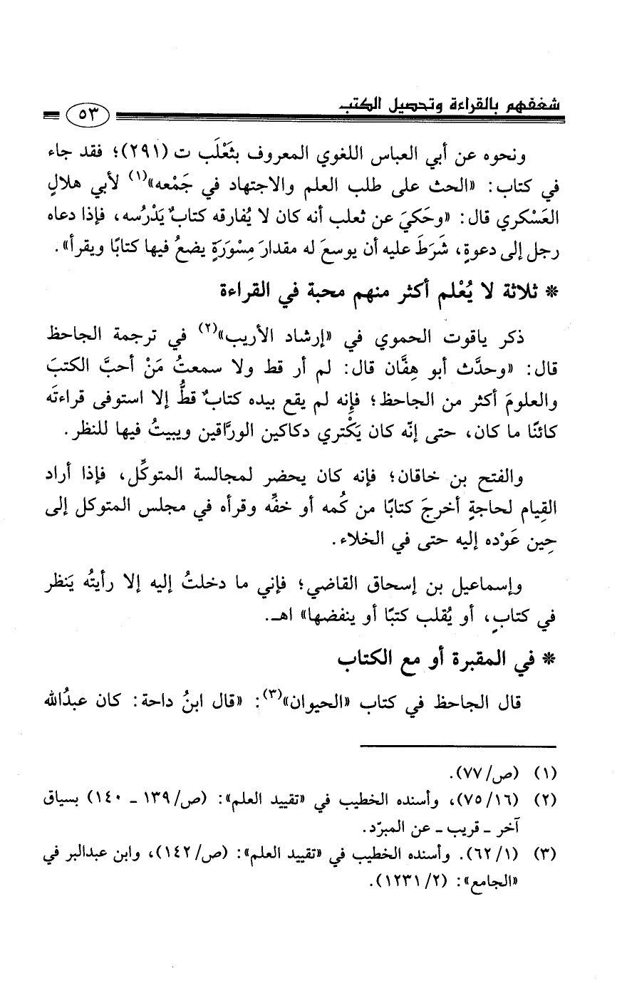 ونحوه عن أبي العباس اللغوي المعروف بثَعْلَب ت (291) ، فقد جاء في كتاب: ((الحث على طلب العلم والاجتهاد في جَمْعه)) (1) لأبي هلالٍ العَسْكري قال: ((وحَكيَ عن ثعلب أنه كان لا يُفارقه كتابٌ يَدْرُسه، فإذا دعاه رجل إلى دعوةٍ، شَرَطَ عليه أن يوسعَ له مقدارَ مِسْوَرَةٍ يضعُ فيها كتابًا ويقرأ)) .
