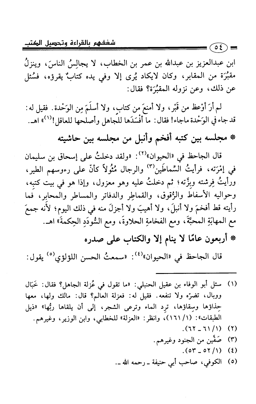 (1) سئل أبو الوفاء بن عقيل الحنبلي: ((ما تقول في عُزلة الجاهل؟ فقال: خَبَال ووبال، تضرّه ولا تنفعه. فقيل له: فعزلة العالم؟ قال: مالك ولها، معها حِذاؤها وسِفاؤها، ترِد الماء وترعى الشجر، إلى أن يلقاها ربُّها)) ((ذيل الطبقات)) : (1/161) ، وانظر: ((العزلة)) للخطابي، وابن الوزير، والعودة.