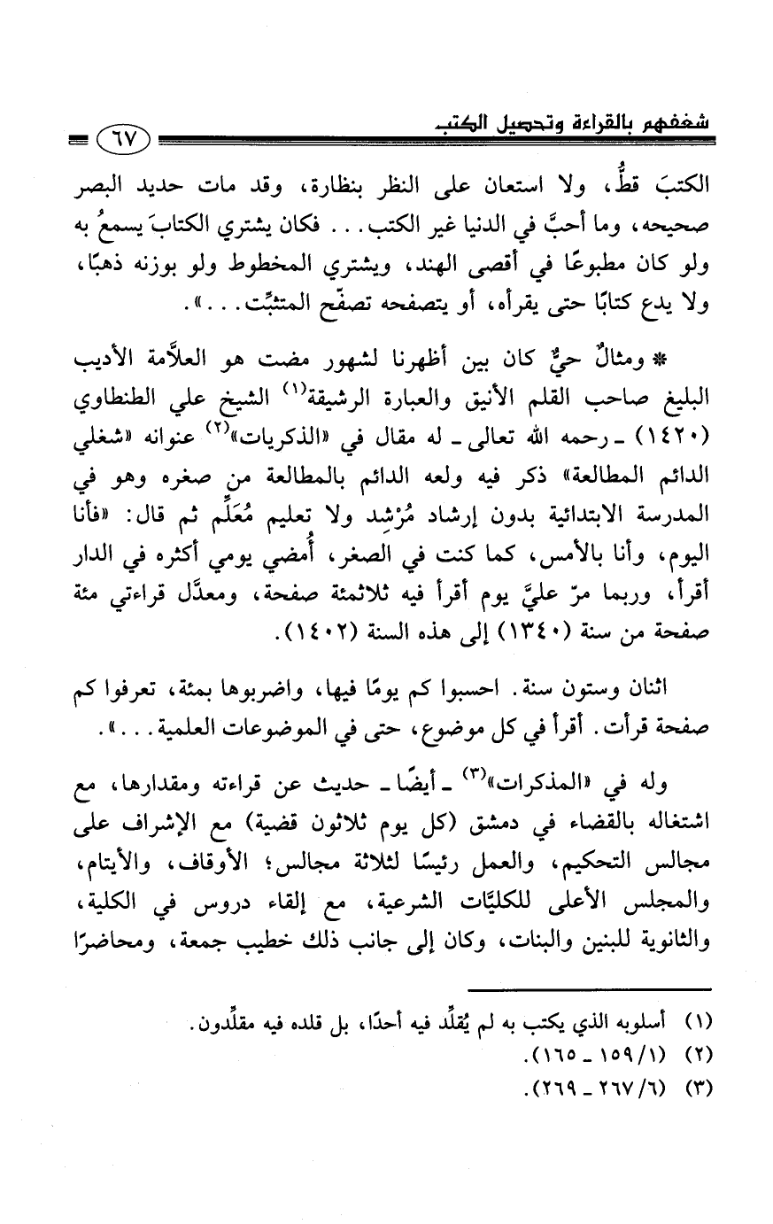 * ومثالٌ حيٌّ كان بين أظهرنا لشهور مضت هو العلاَّمة الأديب البليغ صاحب القلم الأنيق والعبارة الرشيقة (1) الشيخ علي الطنطاوي (1420) -رحمه الله تعالى- له مقال في ((الذكريات)) (2) عنوانه ((شغلي الدائم المطالعة)) ذكر فيه ولعه الدائم بالمطالعة من صغره وهو في المدرسة الابتدائية بدون إرشاد مُرْشِد ولا تعليم مُعَلِّم ثم قال: ((فأنا اليوم، وأنا بالأمس، كما كنت في الصغر، أمضي يومي أكثره في الدار أقرأ، وربما مرّ عليَّ يوم أقرأ فيه ثلاثمئة صفحة، ومعدَّل قراءتي مئة صفحة من سنة (1340) إلى هذه السنة (1402) .