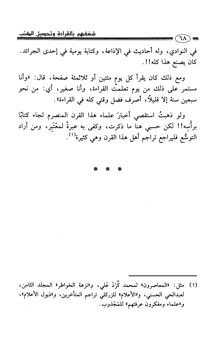 ومع ذلك كان يقرأ كل يوم يومٍ مئتين أو ثلاثمئة صفحة، قال: ((وأنا مستمر على ذلك من يوم تعلمت القراءة، وأنا صغير، أي: من نحو سبعين سنة إلا قليلاً، أصرف فضل وقتي كله في القراءة)) .