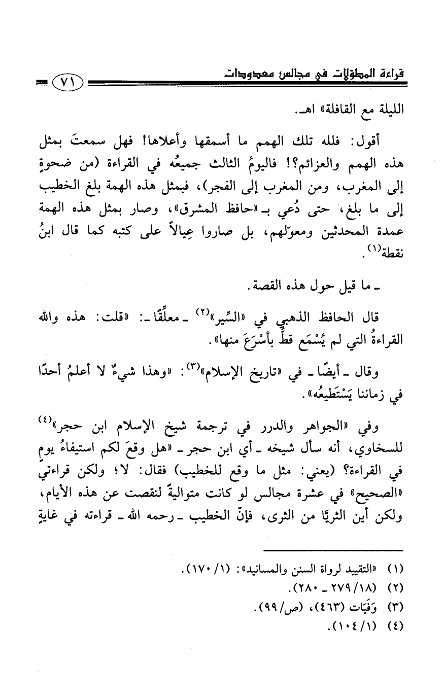 أقول: فلله تلك الهمم ما أسمقها وأعلاها! فهل سمعت بمثل هذه الهمم والعزائم؟ ! فاليومُ الثالث جميعُه في القراءة (من ضحوةِ إلى المغرب، ومن المغرب إلى الفجر) ، فبمثل هذه الهمة بلغ الخطيب إلى ما بلغ، حتى دُعي بـ ((حافظ المشرق)) ، وصار بمثل هذه الهمة عمدة المحدثين ومعوّلهم، بل صاروا عِيالاً على كتبه كما قال ابنُ نقطة (1) .