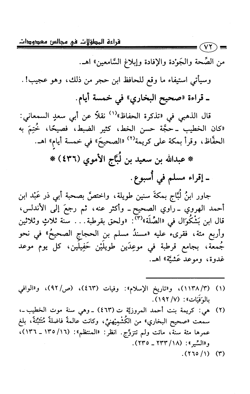(2) هي: كريمة بنت أحمد المروزيَّة ت (463) -وهي سنة موت الخطيب-، سمعت ((صحيح البخاري)) من الكُشْمِيْهنيِّ، وكانت عالمةً فاضلةً مُتَثبِّتةً، بلغ عمرها مئة سنة، ماتت ولم تتزوَّج. انظر: ((المنتظم)) : (16/ 135- 136) ، و ((السِّير)) : (18/ 233- 235) .