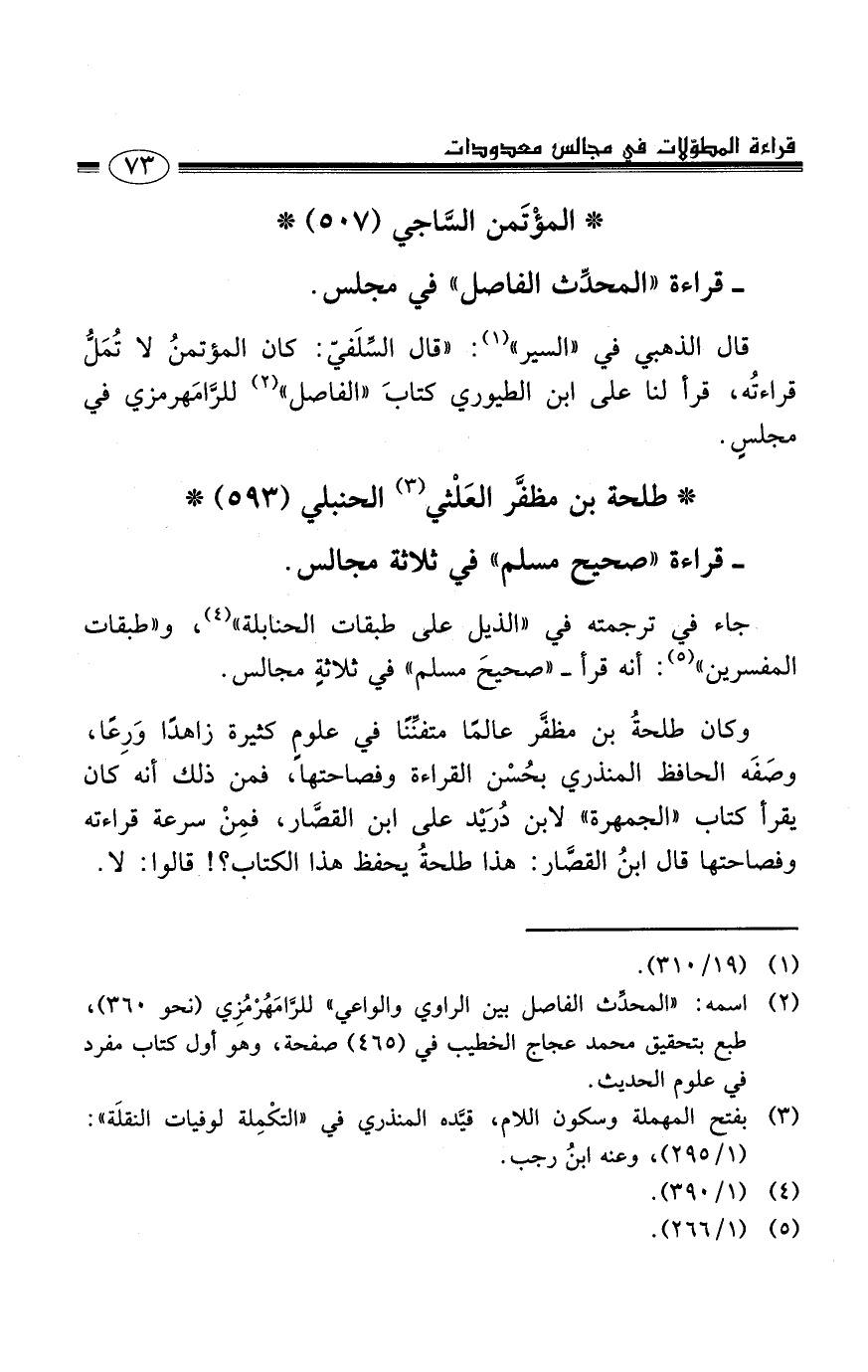 جاء في ترجمته في ((الذيل على طبقات الحنابلة)) (4) و ((طبقات المفسرين)) (5) : أنه قرأ - ((صحيحَ مسلم)) في ثلاثةِ مجالس.