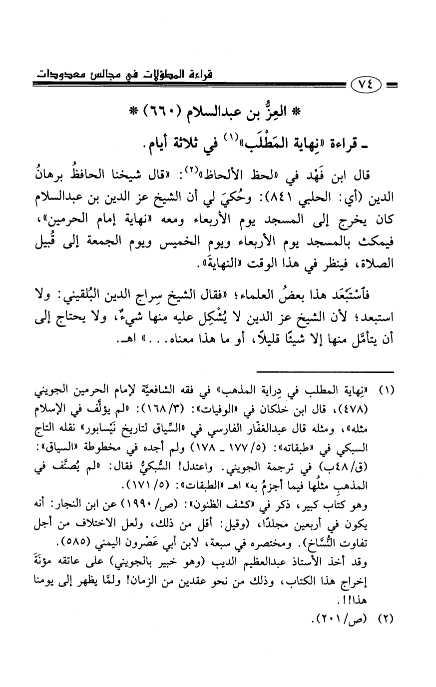 قال ابن فَهْد في ((لحظ الألحاظ)) (2) : ((قال شيخنا الحافظُ برهانُ الدين (أي: الحلبي 841) : وحُكيَ لي أن الشيخ عز الدين بن عبد السلام كان يخرج إلى المسجد يوم الأربعاء ومعه ((نهاية إمام الحرمين)) ، فيمكث بالمسجد يوم الأربعاء ويوم الخميس ويوم الجمعة إلى قُبيل الصلاة، فينظر في هذا الوقت ((النهايةَ)) .