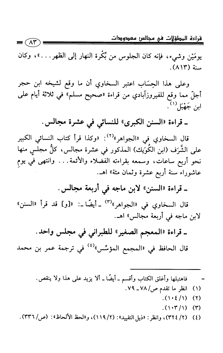 قال السخاوي في ((الجوهر)) (3) -أيضًا-: (( [و] قد قرأ ((السنن)) لابن ماجه في أربعة مجالس)) اهـ.