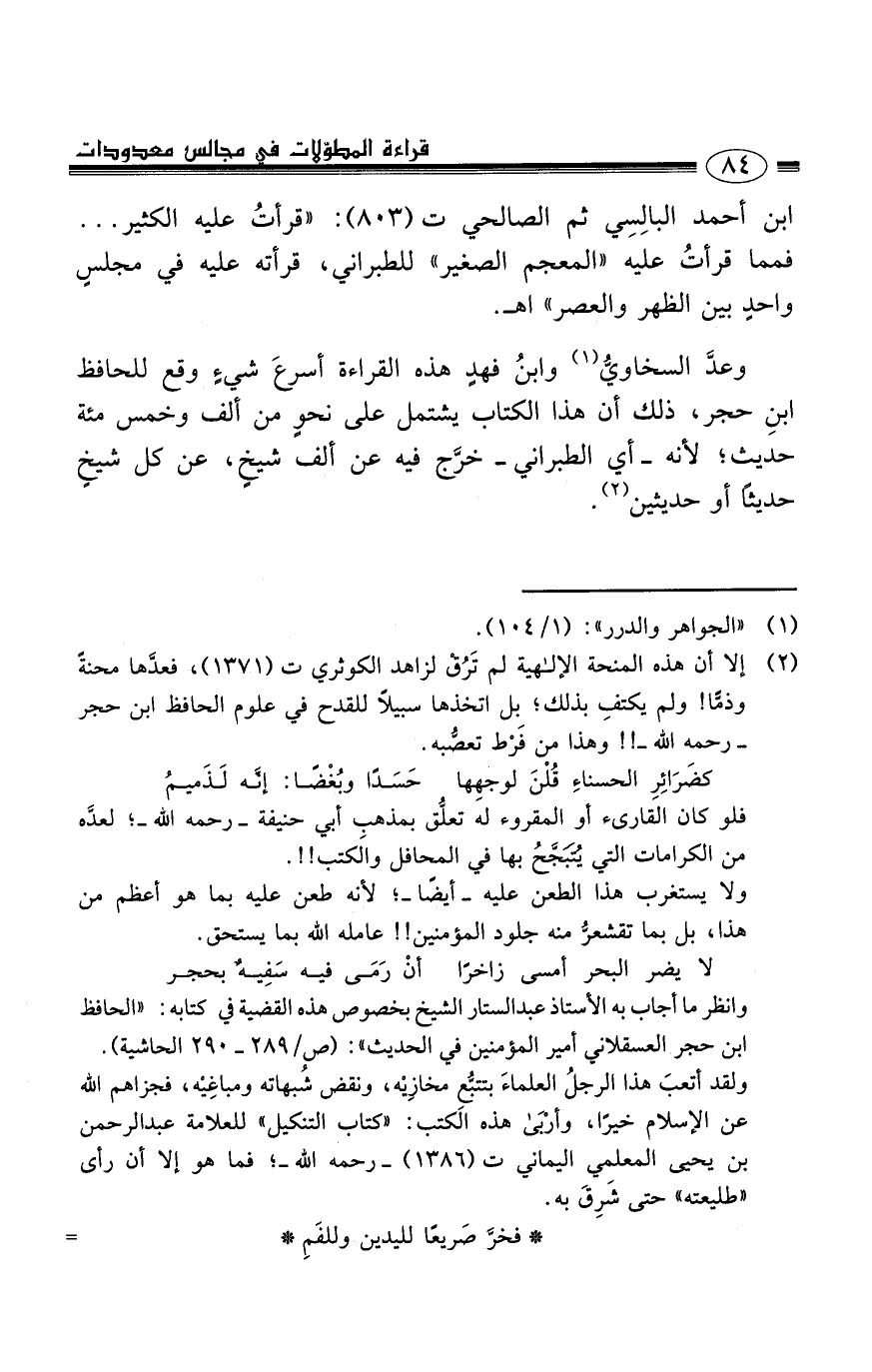 (2) إلا أن هذه المنحة الإلهية لم تَرُقْ لزاهد الكوثري ت (1371) ، فعدَّها محنةً وذمًّا! ولم يكتفِ بذلك، بل اتخذها سبيلاً للقدح في علوم الحافظ ابن حجر -رحمه الله-!! وهذا من فَرْط تعصُّبه.