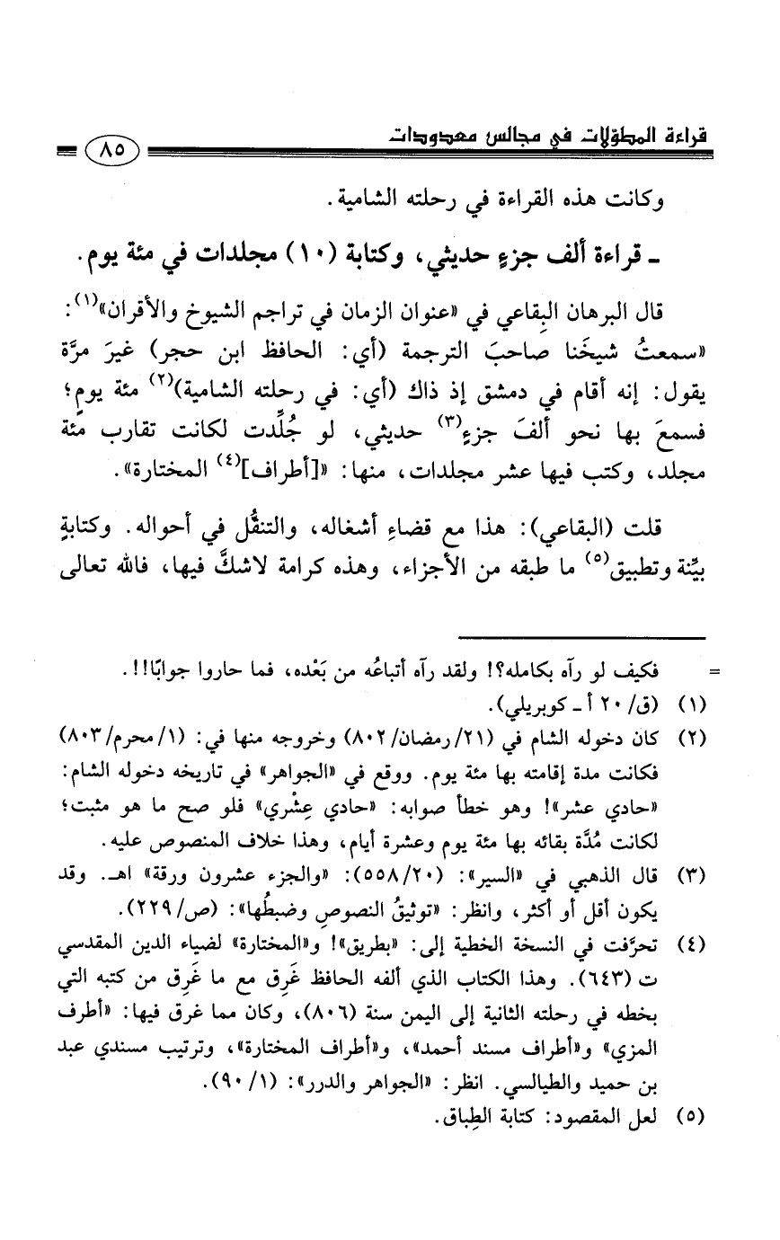 قلت (البقاعي) : هذا مع قضاءِ أشغاله، والتنقُّل في أحواله. وكتابةٍ بيِّنة وتطبيق (5) ما طبقه من الأجزاء، وهذه كرامة لا شكَّ فيها، فالله تعالى