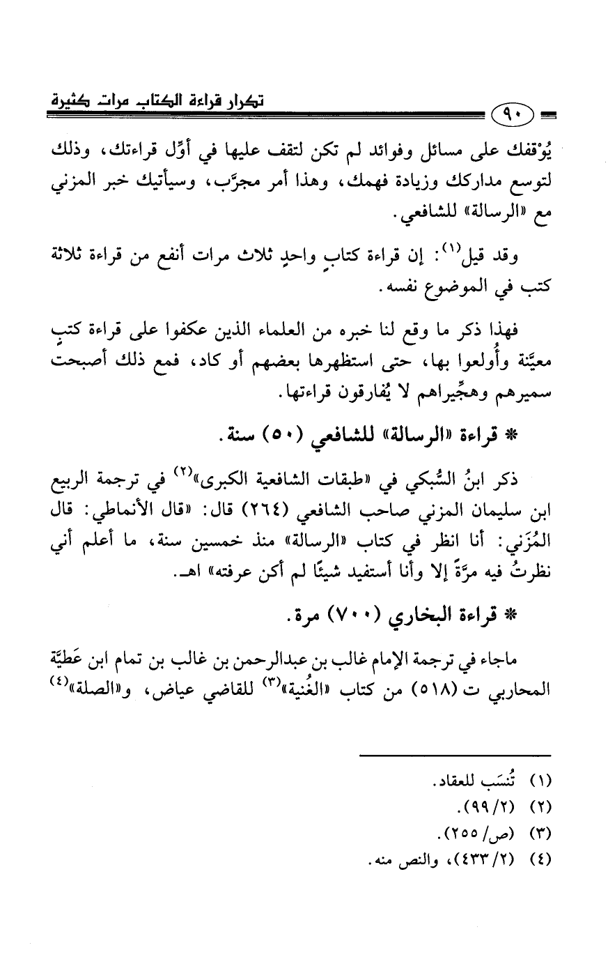يُوْقفك على مسائل وفوائد لم تكن لتقف عليها في أوِّل قراءتك، وذلك لتوسع مداركك وزيادة فهمك، وهذا أمر مجرَّب، وسيأتيك خبر المزني مع ((الرسالة)) للشافعي.