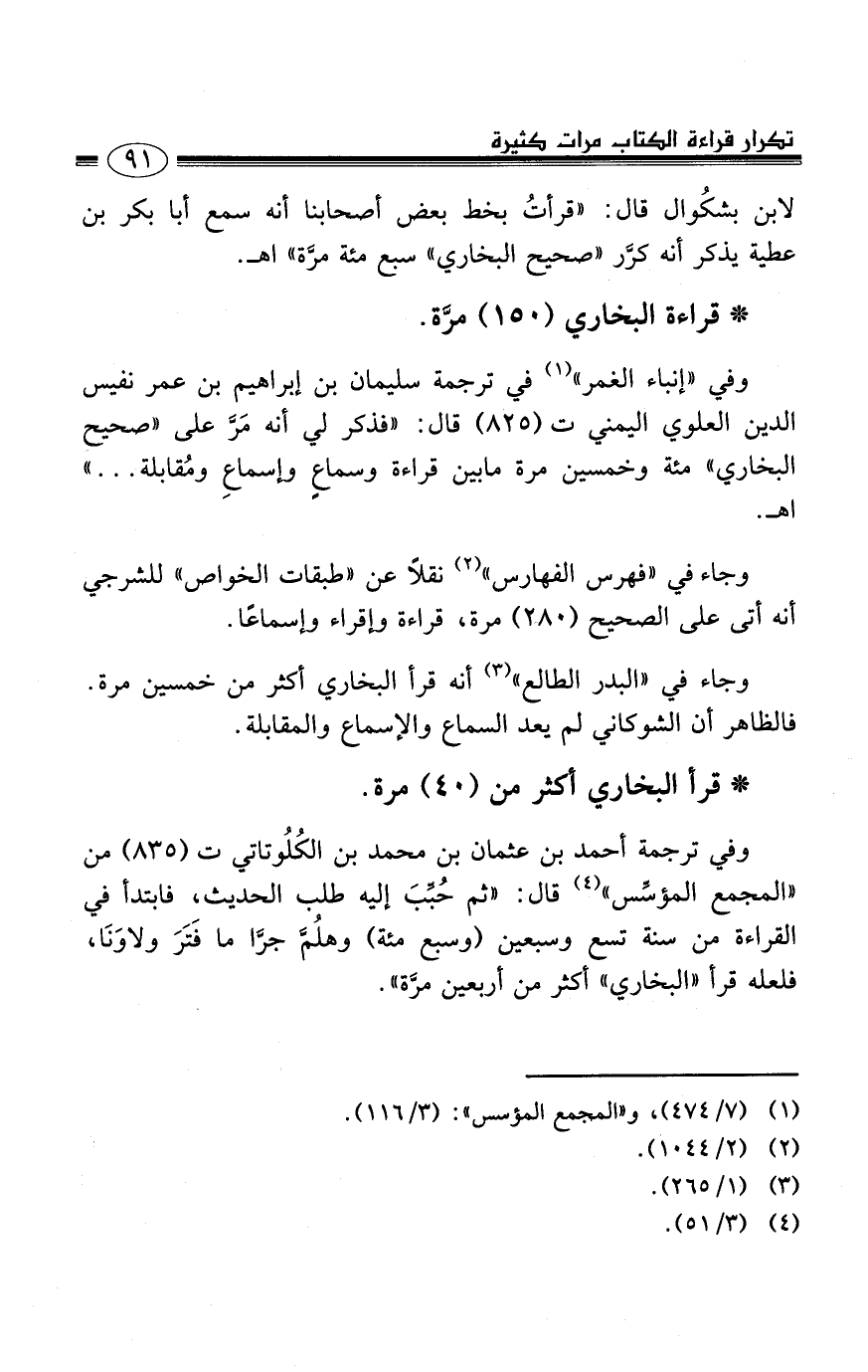 وفي ترجمة أحمد بن عثمان بن محمد بن الكُلُوتاتي ت (835) من ((المجمع المؤسِّس)) (4) قال: ((ثم حُبِّبَ إليه طلب الحديث، فابتدأ في القراءة من سنة تسع وسبعين (وسبع مئة) وهلُمَّ جرَّا ما فَتَرَ ولاوَنَا، فلعله قرأ ((البخاري)) أكثر من أربعين مرَّة)) .
