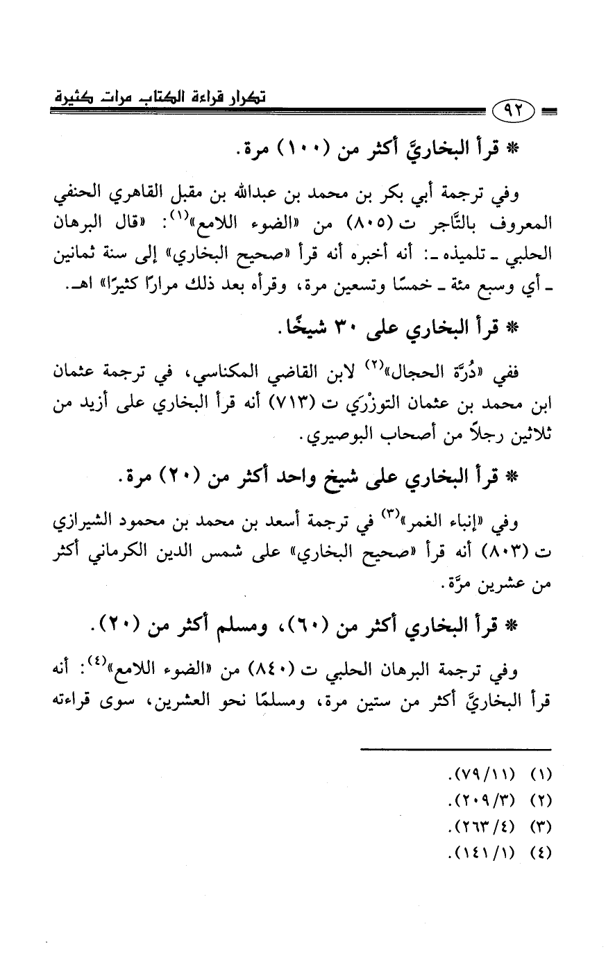 وفي ترجمة البرهان الحلبي ت (840) من ((الضوء اللامع)) (4) : أنه قرأ البخاريَّ أكثر من ستين مرة، ومسلمًا نحو العشرين، سوى قراءته