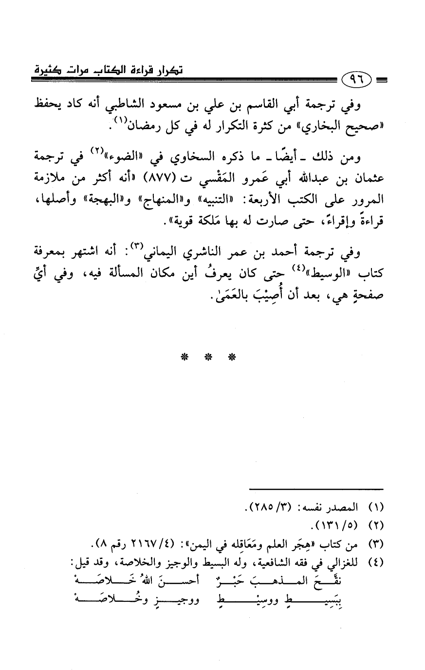 ومن ذلك- أيضًا- ما ذكره السخاوي في ((الضوء)) (2) في ترجمة عثمان بن عبد الله أبي عَمرو المَقْسي ت (877) ((أنه أكثر من ملازمة المرور على الكتب الأربعة: ((التنبيه)) و ((المنهاج)) و ((البهجة)) وأصلها، قراءةً وإقراءً، حتى صارت له بها مَلكة قوية)) .