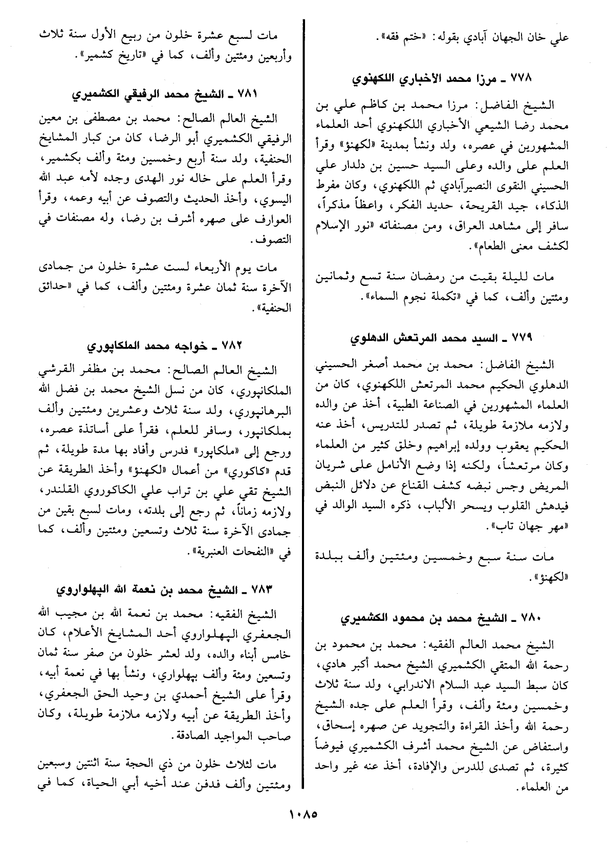 المشايخ الحنفية، ولد سنة أربع وخمسين ومائة وألف بكشمير، وقرأ العلم على خاله نور الهدى وجده