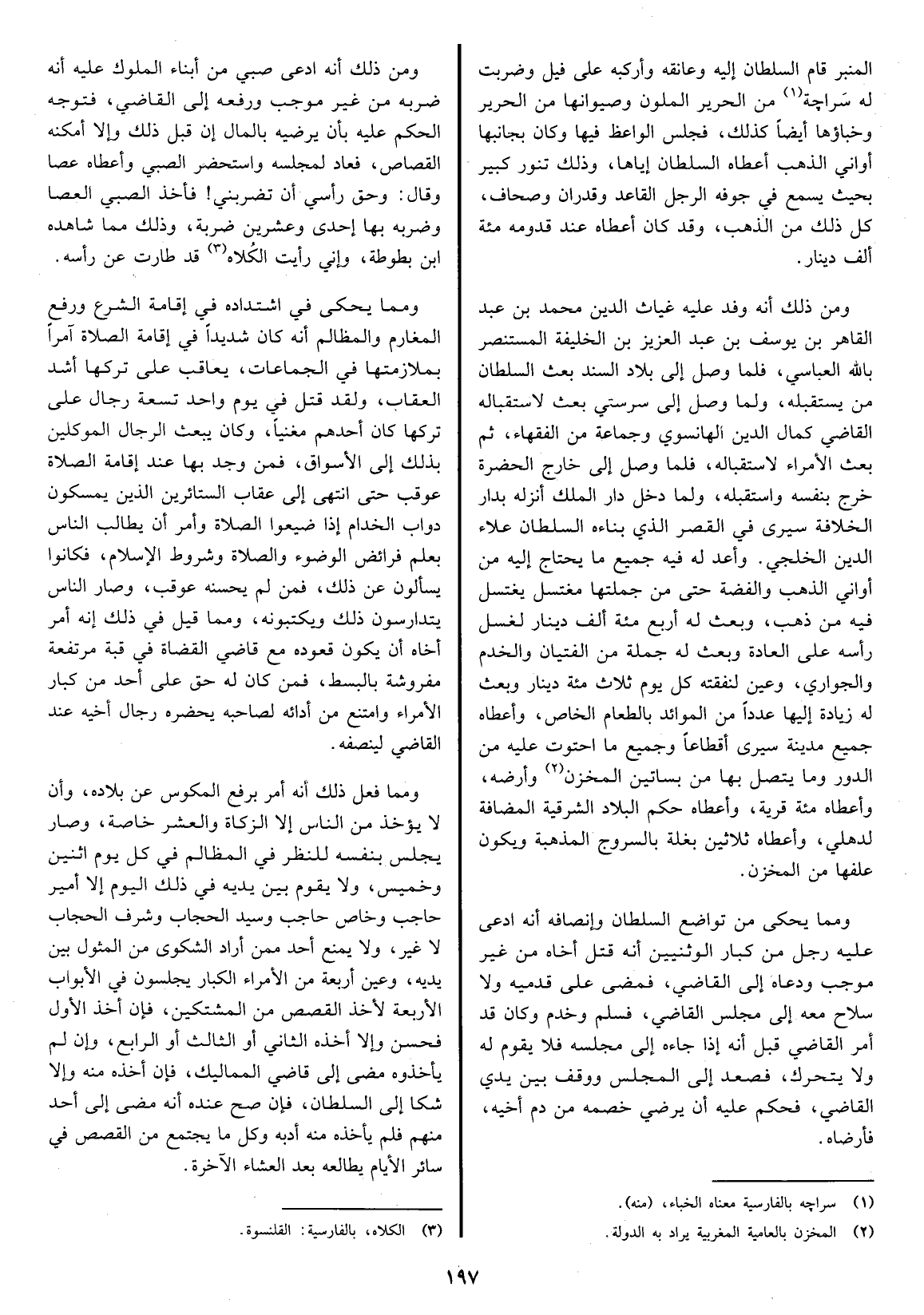 المنبر قام السلطان إليه وعانقه وأركبه على فيل وضربت له سراجة من الحرير