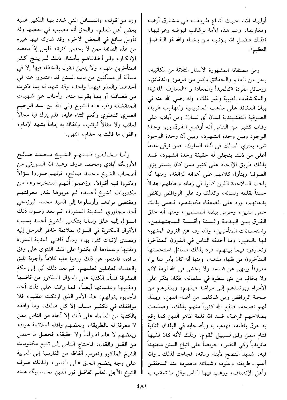 حقيقة وحدة الشهود، فسد بذلك طريق الإلحاد على كثير ممن كان يتستر بزي الصوفية ويتأول كلامهم