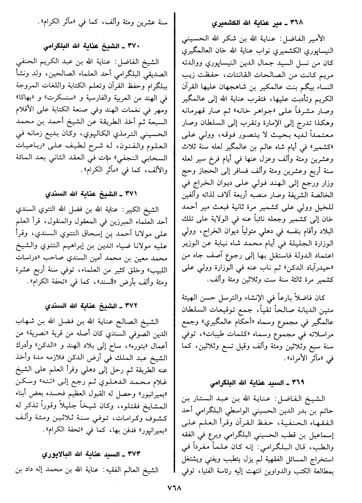 الشيخ الفاضل عناية الله بن عبد الستار بن حاتم بن بدر الدين الحسيني الواسطي البلكرامي أحد