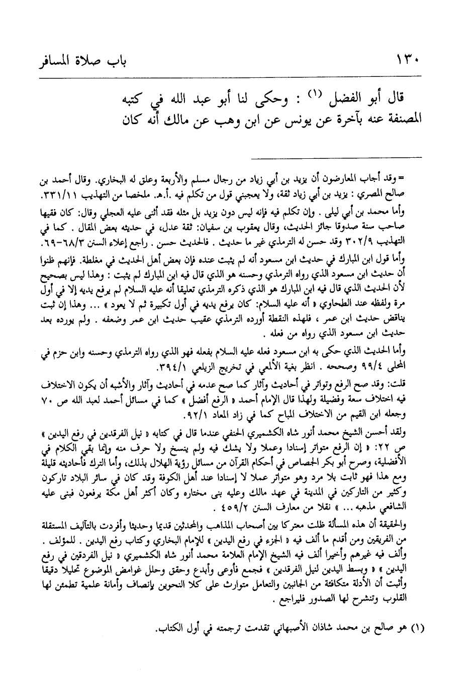 َقَالَ أَبُوْ الْفَضْل: وحكى لنا أَبُوْ عَبْد اللهِ فِي كتبه المصنفة عنه بآخرة عَن يونس عَنِ ابْنِ وهب عَن مَالك أَنَّهُ كان