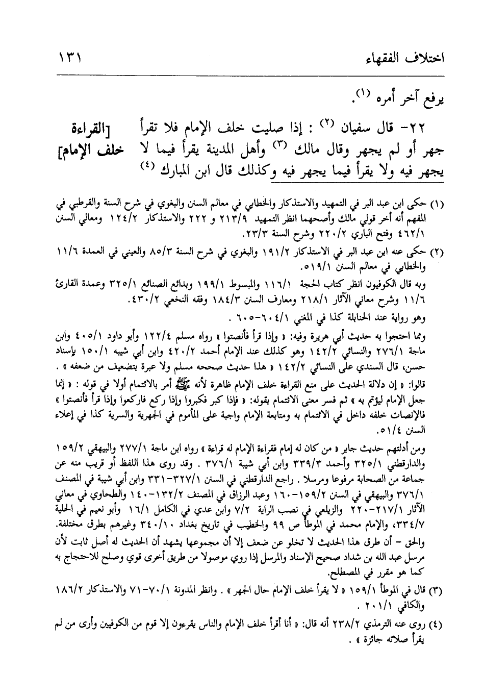 22- قَالَ سُفْيَانُ: إِذَا صليت خلف الْإِمَام فلا تقرأ خلفه جهر أو لم يجهر.