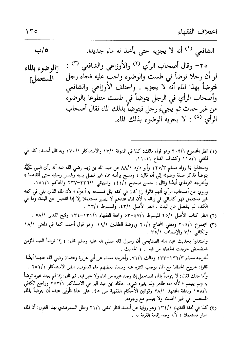 25- وَقَالَ أَصْحَابُ الرَّأْيِ وَالْأَوْزَاعِيُّ وَالشَّافِعِيُّ: لو أن رجلا توضأ فِي طست والْوُضُوْء واجب عَلَيْهِ فجاءرجل فتوضأ بهَذَا المَاء أنه لَا يجزيه.