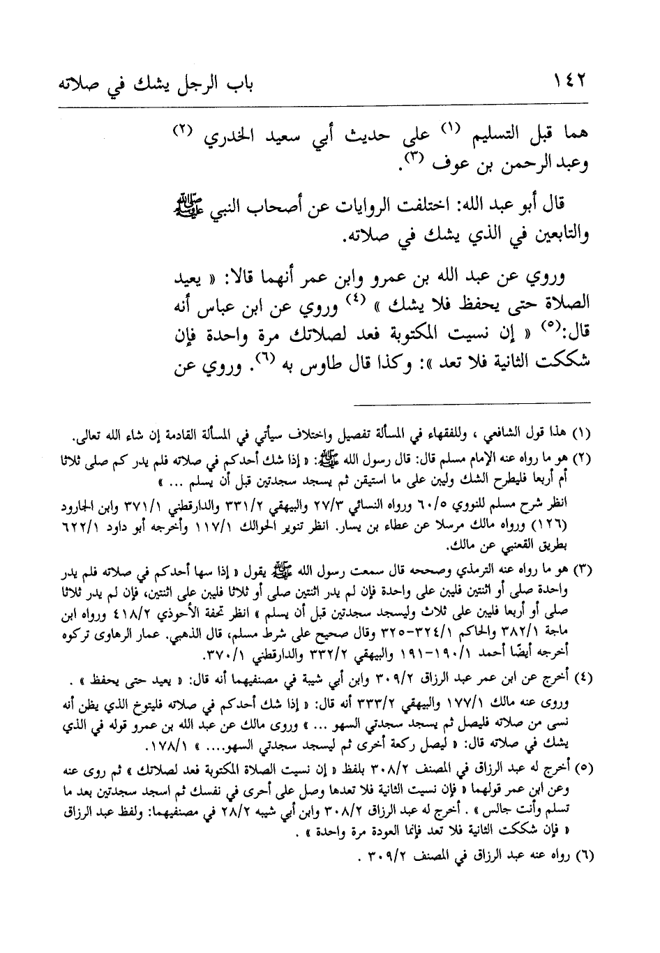 قَالَ أَبُوْ عَبْدِ اللهِ: واختلفت الروايات عَن أَصْحَاب النَّبِيّ صَلَّى اللهُ عَلَيْهِ وَسَلَّمَ والتابعين فِي الذي يشك فِي صلاته.