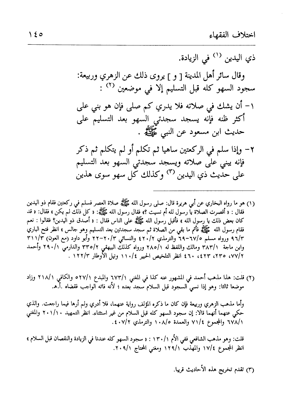 2- وإِذَا سلم فِي الرَّكْعَتَيْنِ ساهيا ثُمَّ تكلم أَوْ لم يتكلم ثُمَّ ذكر فَإِنَّهُ يبني عَلَى صلاته ويسجد سجدتي السَّهْو بَعْد التسليم عَلَى حَدِيْث ذي