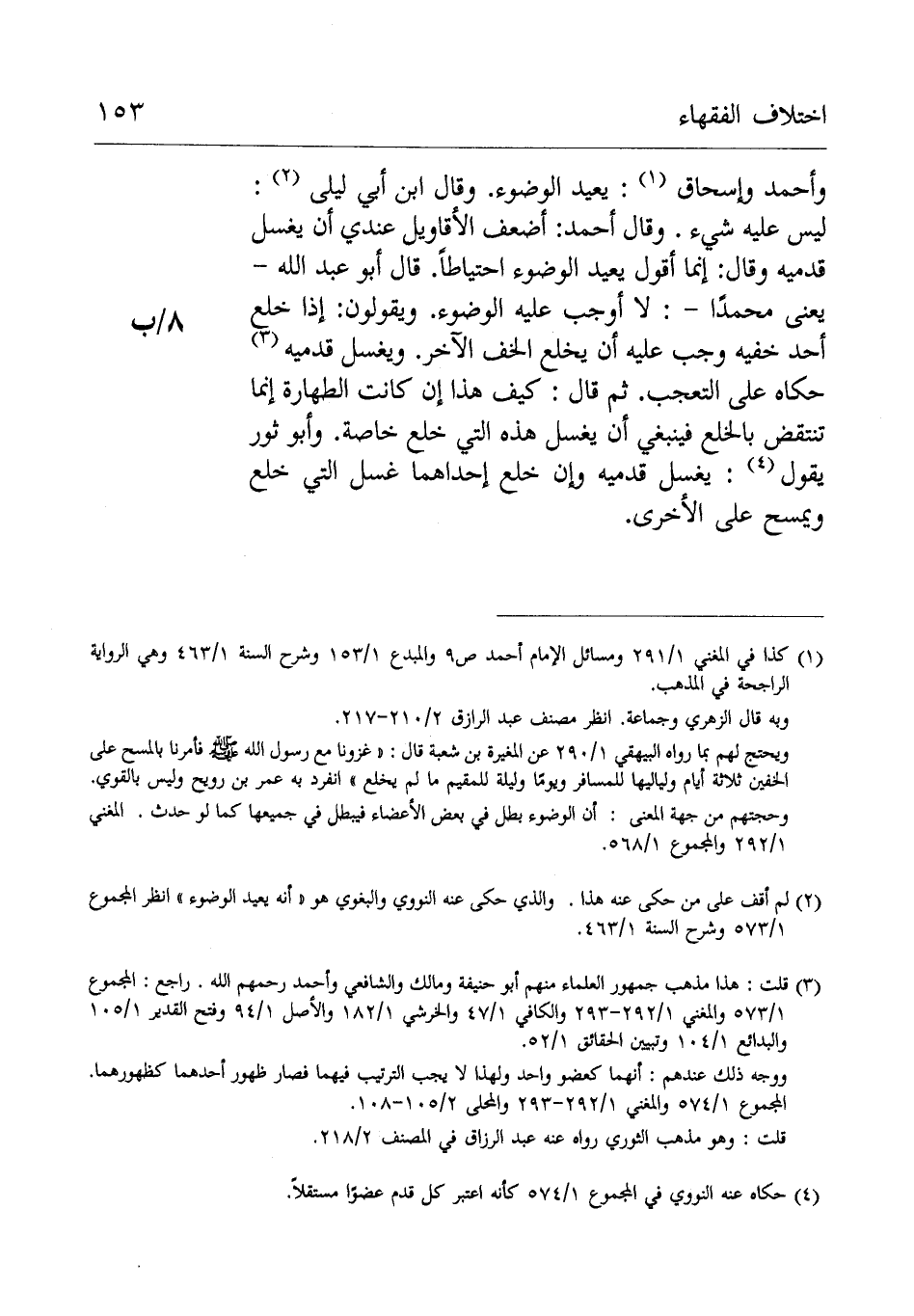 ويقولون: إِذَا خلع أحد خفيه وجب عَلَيْهِ أن يخلع الخف الآخر ويغسل قدميه حكاه عَلَى التعجب؛ ثُمَّ قَالَ: كَيْفَ هَذَا إن كانت الطهارة إنما تنتقض بالخلع فينبغي أن يغسل هَذِهِ التي خلع خاصة.