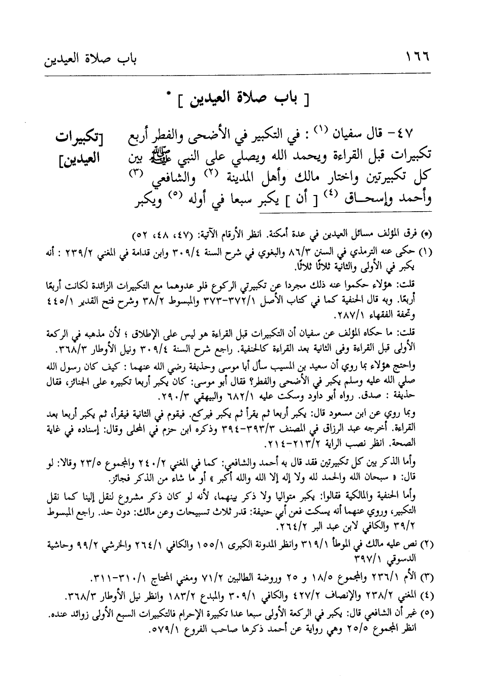 47- قَالَ سُفْيَانُ: فِي التكبير فِي الأضحى والفطر أربع تكبيرات قبل القِرَاءَة ويحمد الله ويُصَلِّي عَلَى النَّبِيّ صَلَّى اللهُ عَلَيْهِ وَسَلَّمَ بين كُلّ تكبيرتين