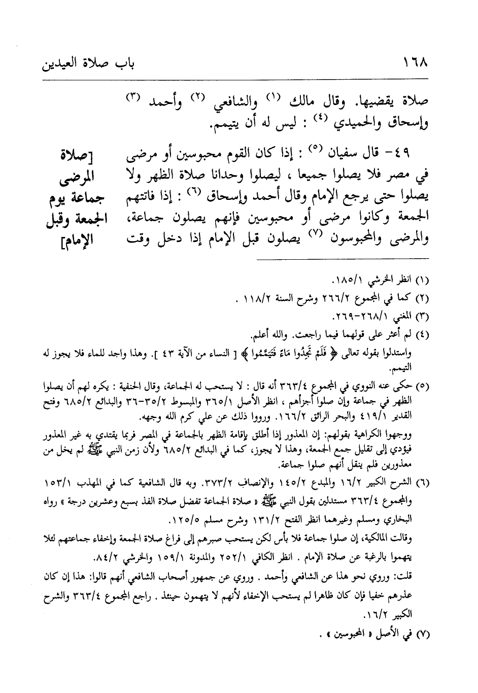 49- قَالَ سُفْيَانُ: إِذَا كَانَ القوم محبسين أَوْ مرضى فِي مصر فلا يصلوا
