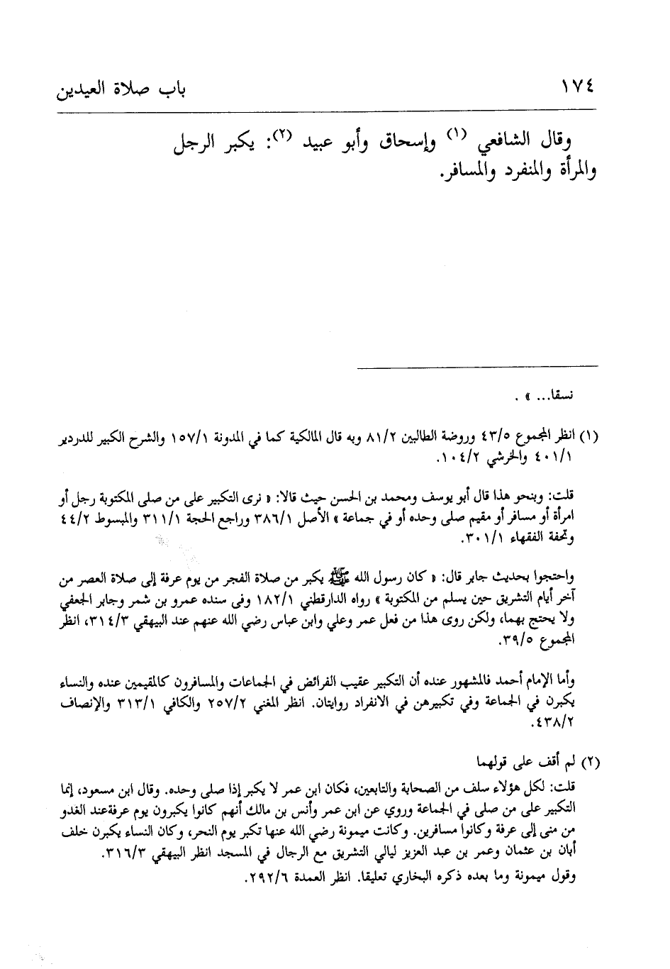 وَقَالَ الشَّافِعِيُُّ وَإِسْحَاقُ وأَبُوْعُبَيْدٍ يكبر الرَّجُل والْمَرْأَة والمنفرد والْمُسَافِر