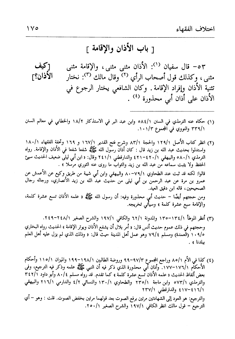 53-قَالَ سُفْيَانُ: الأذان مثنى مثنى والإقامة مثنى مثنى وكذَلِكَ قَوْل أَصْحَاب الرَّأْيِ.