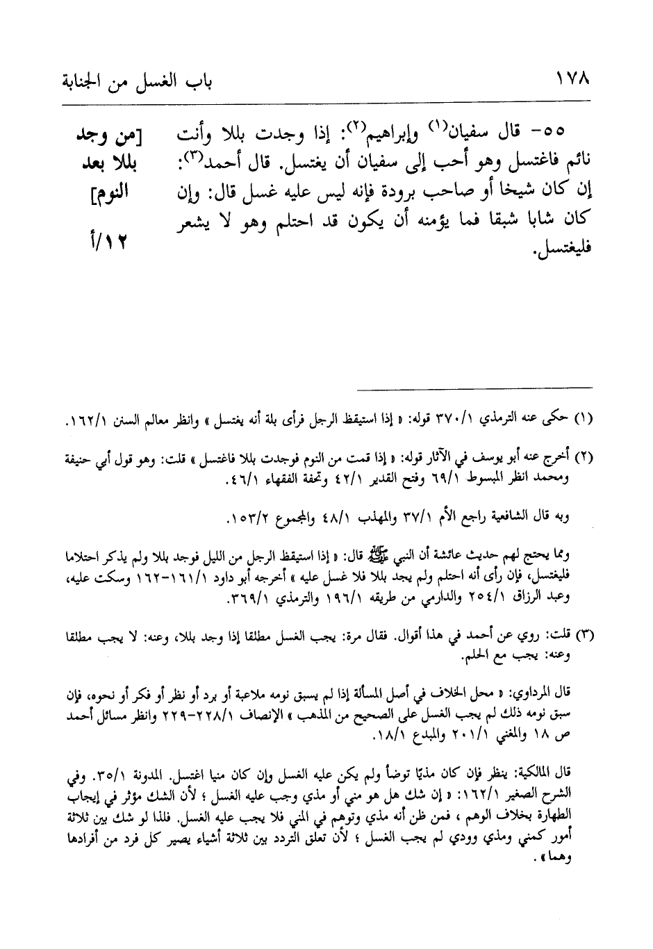 55- قَالَ سُفْيَانُ: وإِبْرَاهِيْم إِذَا وجدت بللا وأنت نائم فاغتسل وَهُوَ أحب إِلَى سُفْيَان أن يغتسل