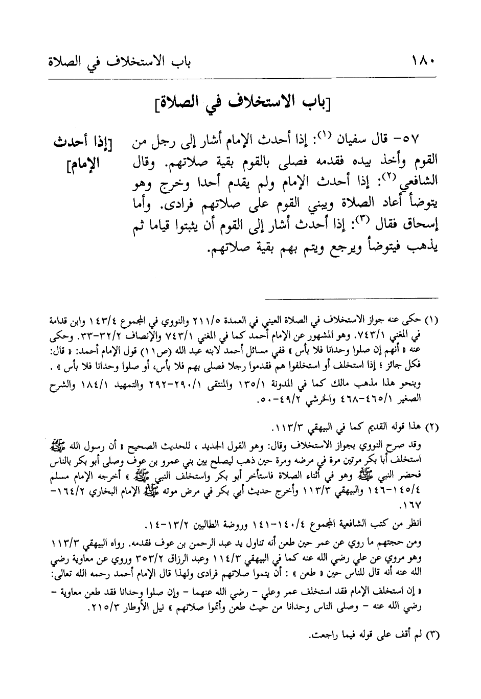 وأما إِسْحَاق فقال: إِذَا أَحْدَثَ أشار إِلَى القوم أن يثبتوا قياما ثُمَّ يذهب فيتوضأ ويرجع ويتم بهم بقية صلاتهم