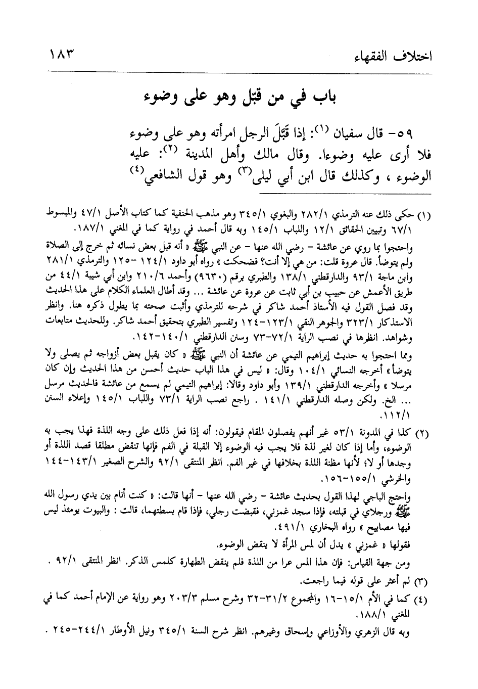 59- قَالَ سُفْيَانُ: إِذَا قبل الرَّجُل امرأته وَهُوَ عَلَى وضوء فلا أرى عَلَيْهِ وضوءا