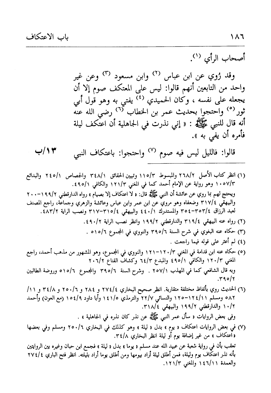 وقد روي عَنِ ابْنِ عَبَّاس وابن مسعود وعنغَيْر واحد من التابعين أَنَّهُم قَالُوْا لَيْسَ عَلَى المعكتف صوم إِلَّا أن يجعله عَلَى نفسه وكَانَ الْحُمَيْدِيّ يفتي بِهِ وَهُوَ قَوْل أبي ثَوْرٍ واحتجوا بحَدِيْث عُمَر بْن الخطاب رضي الله عنه قَالَ: للنبي صَلَّى اللهُ عَلَيْهِ وَسَلَّمَ إني نذرت فِي الجاهلية اعتكاف ليلة فأمره أن يفي به"