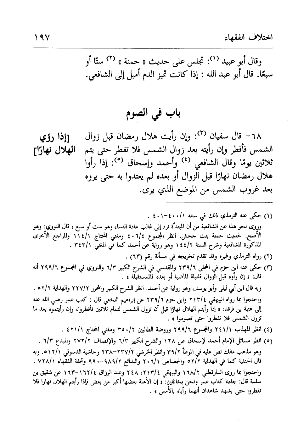 68- قَالَ سُفْيَانُ: وإن رأيت هلال رَمَضَان قبل زوال الشَّمْس فافطر وإن رأيته بَعْد زوال ااشمس فلا تفطر حَتَّى تتم ثلاثين يوما