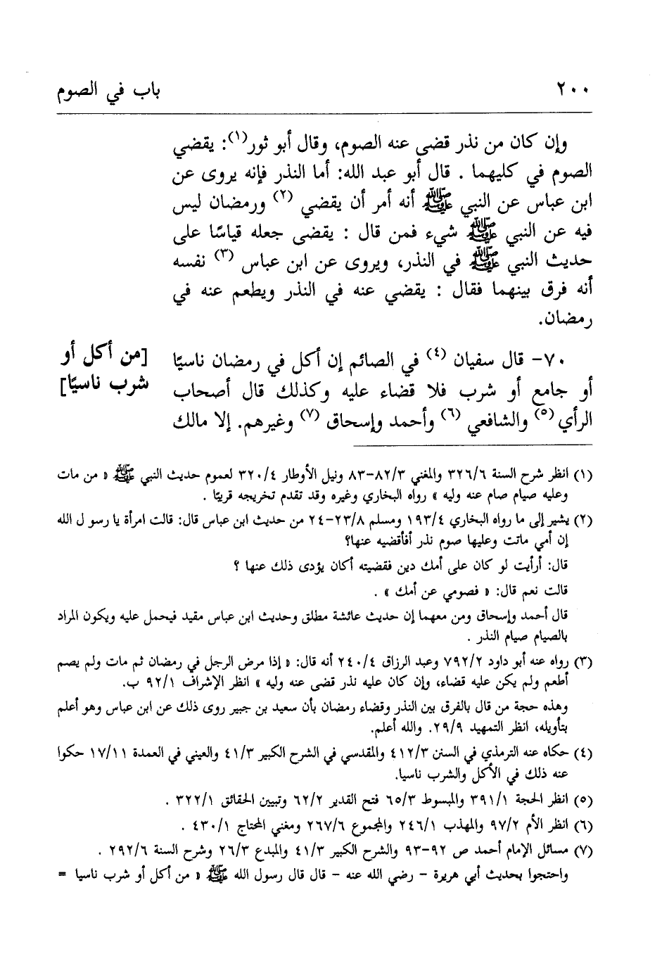 70- قَالَ سُفْيَانُ: فِي الصائم إن أكل فِي شهر رَمَضَان ناسيا أَوْ جامع أَوْ شرب فلا قضاء عَلَيْهِ وكذَلِكَ قَوْل أَصْحَاب الرَّأْيِ والشَّافِعِيّ وأَحْمَد وإِسْحَاق وغيرهم إِلَّا مَالك