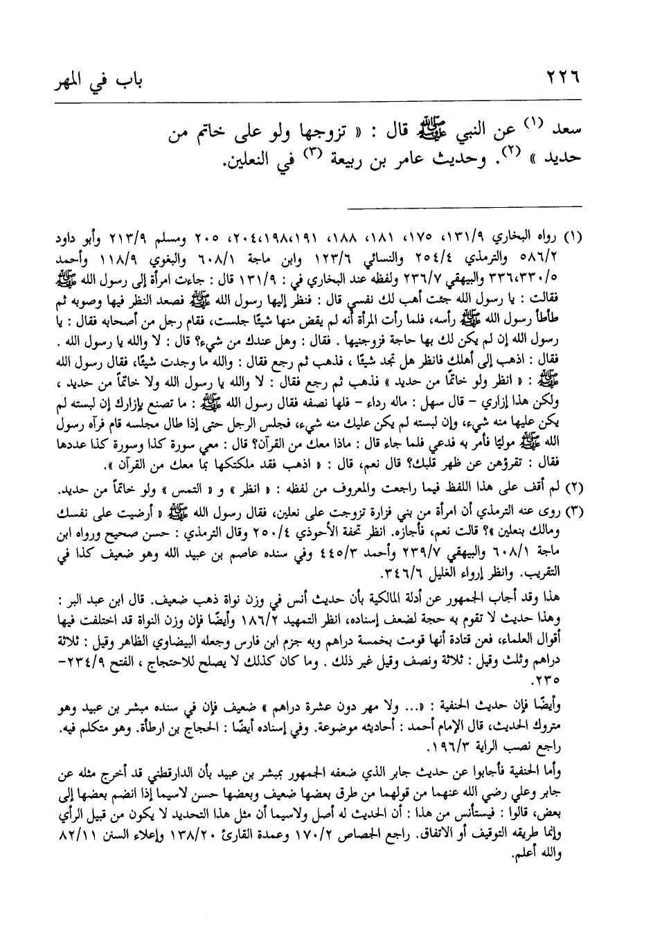 سعد عَن النَّبِيّ صَلَّى اللهُ عَلَيْهِ وَسَلَّمَ تزوجها ولو عَلَى خاتم من حديد وحَدِيْث عامر بْن ربيعة فِي النعلين