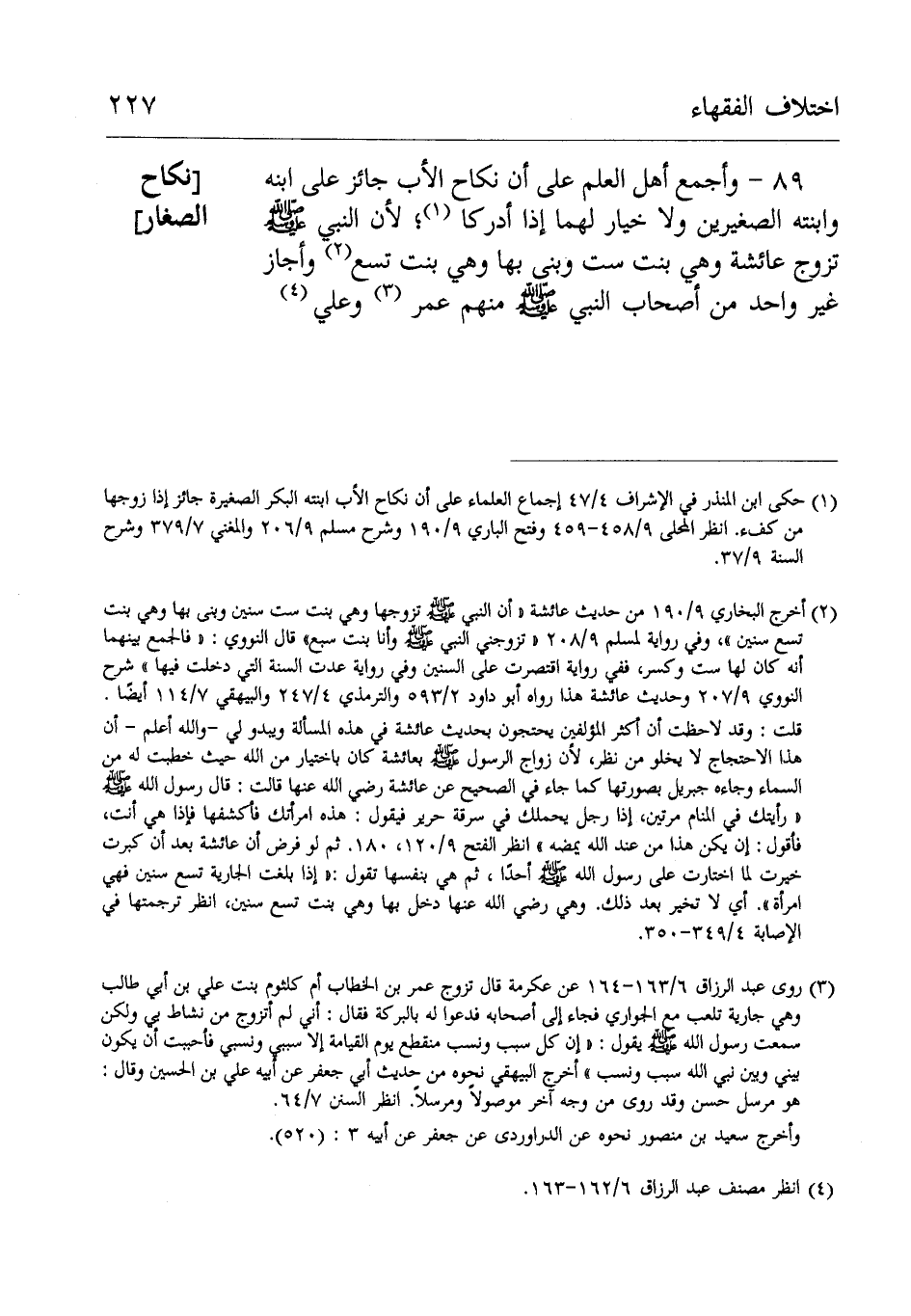 89- وأجمع أَهْل العلم عَلَى أن نكاح الأب جائز عَلَى ابنه وابنته الصغيرين ولا خيار لهما إِذَا أدركا لِأَنَّ النَّبِيّ صَلَّى اللهُ عَلَيْهِ وَسَلَّمَ تزوج عَائِشَة وهي بنت ست وبنى بِهَا وهي بنت تسع.