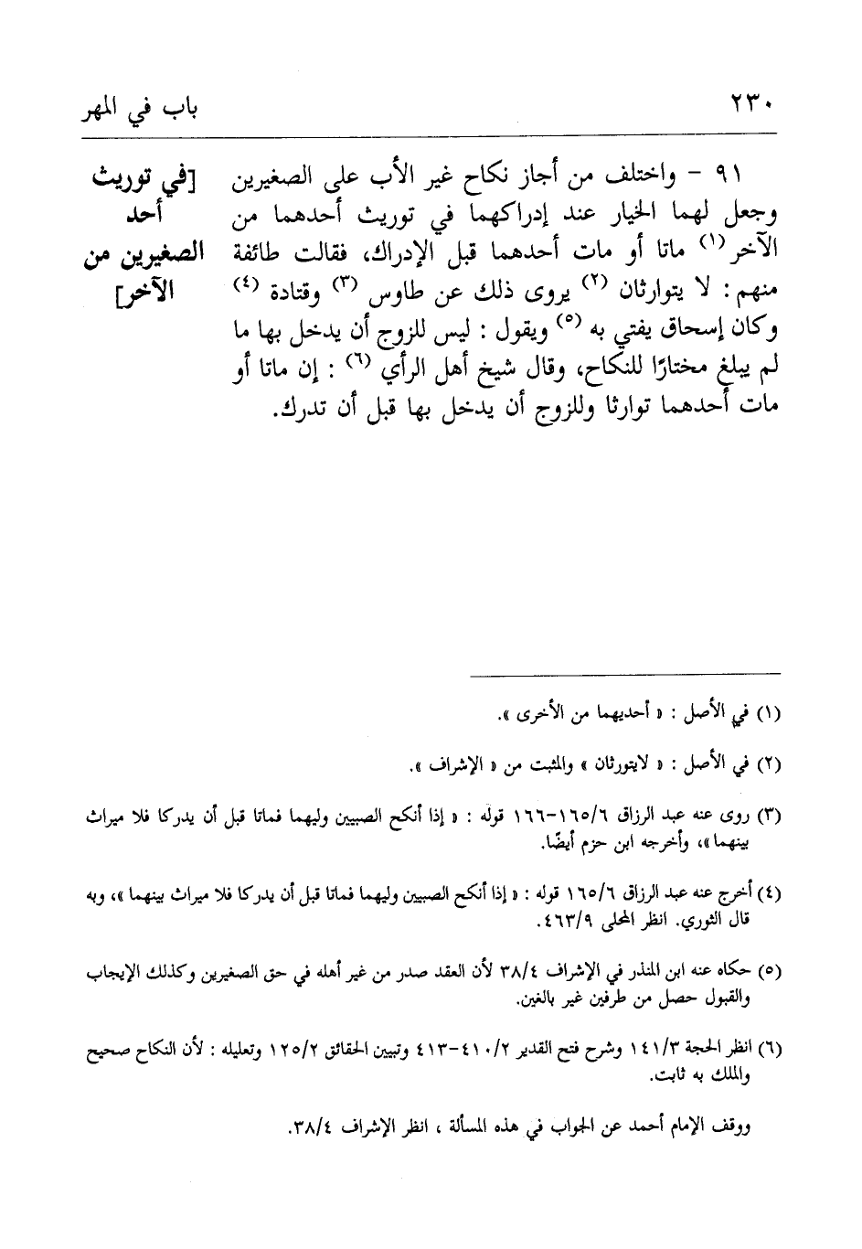 91- واخْتَلَفَمن أجاز نكاحغَيْر الأب عَلَى الصغيرين وجعل لهما الخيار عِنْدَ إدراكهما فِي توريث أحدهما من الآخر ماتا أَوْ مَاتَ أحدهما قبل الإدراك