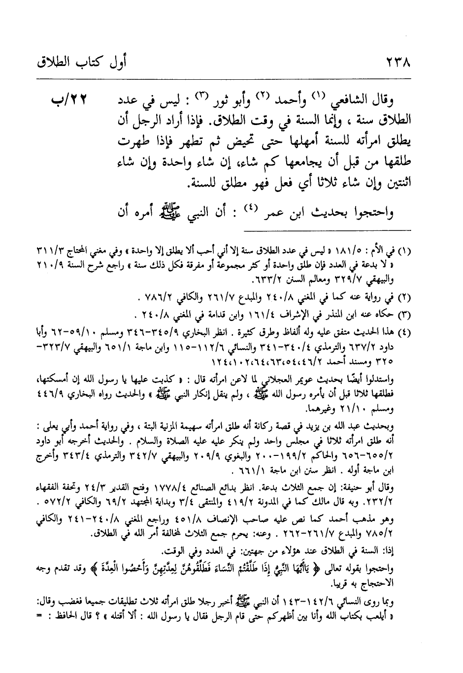 وَقَالَ الشَّافِعِيُُّ وَأَحْمَدُ وأَبُوْثَوْرٍ: لَيْسَ فِي عدة الطلاق سنة وإنما السنة فِي وقت الطلاق فَإِذَاأراد رجل أن يطلق امرأته للسنة أمهلها حَتَّى تحيض ثُمَّ تطهر فَإِذَاطهرت طلقها من قبل أن يجامعها كم شاء إن شاء واحدة وإن شاء اثنتين وإن شاء ثلاثا أي ذَلِكَ فعل فَهُوَ مطلق للسنة واحتجوا بحَدِيْث ابْن عُمَر أَنَّ النَّبِيَّ صَلَّى اللهُ عَلَيْهِ وَسَلَّمَ أمره أن