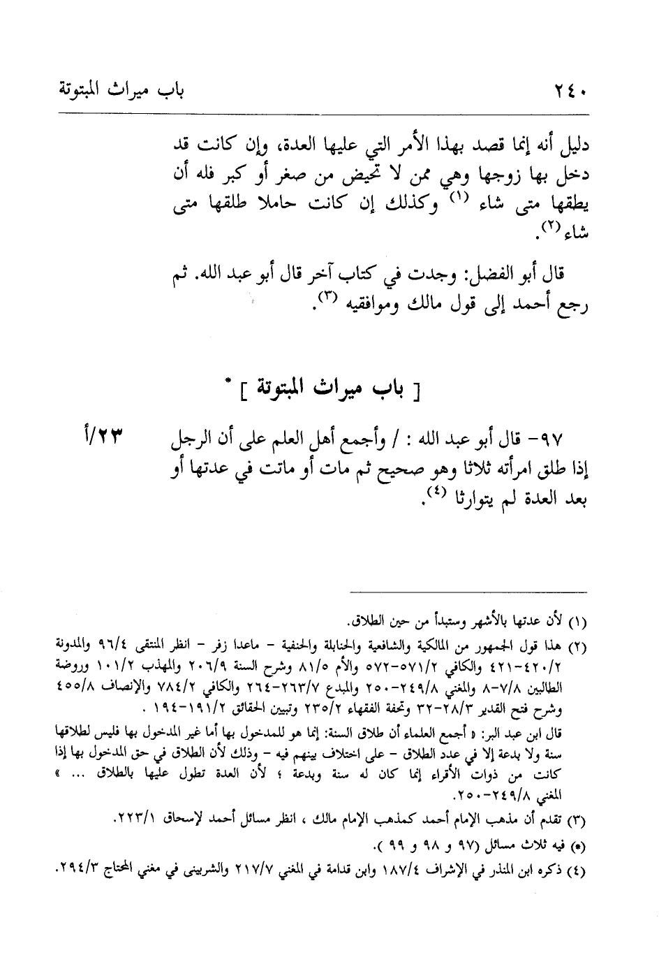 97- قَالَ أَبُوْ عَبْدِ اللهِ: وأجمع أَهْل العلم عَلَى أن الرَّجُل إِذَا طلق امرأته ثلاثا صحيح ثُمَّ مَاتَ أَوْ ماتت فِي عدتها أَوْ بَعْد العدة لم يتوارثه