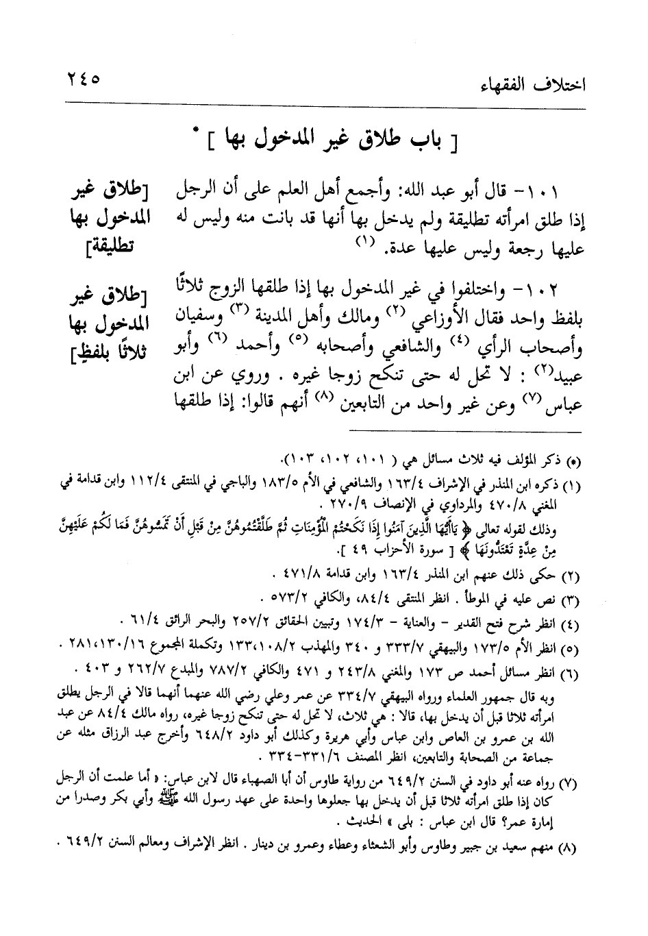 101- قَالَ أَبُوْ عبد الله: وأجمع أَهْل العلم عَلَى أن الرَّجُل إن طلق امرأته تطليقة ولم يدخل بِهَا إنها قد بانت منه ولَيْسَ له عليها رجعة ولَيْسَ عليها عدة.