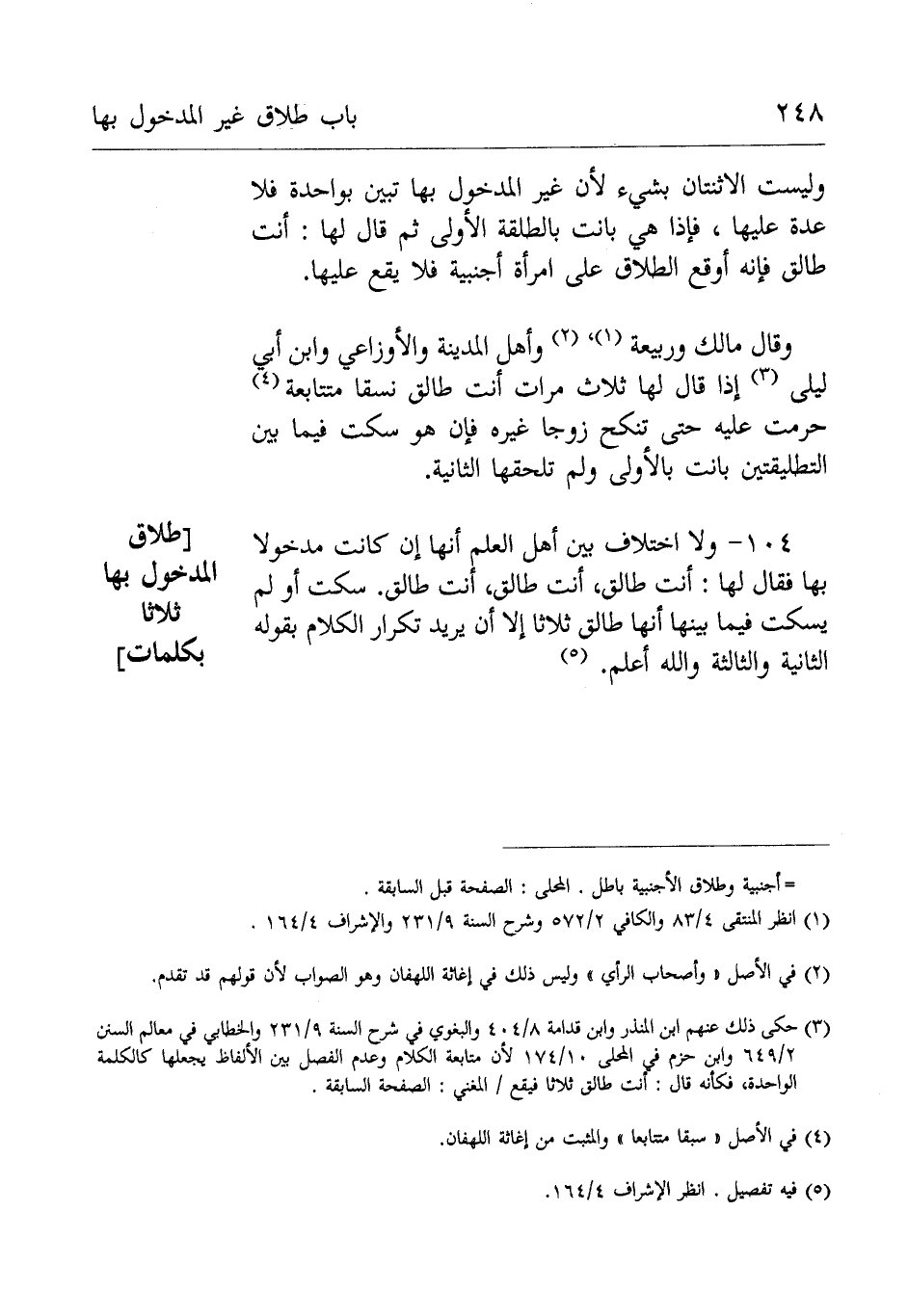 104- ولا اختلاف بين أَهْل العلم أَنَّهُا إِذَا كانت مدخولا بِهَا فقَالَ لها أَنْتَ طالق أَنْتَ طالق أَنْتَ طالق سكت أَوْ لم يسكت فيما بينهما عنها طالق ثلاثا إِلَّا أن يريد تكرار الكلام بقوله الثانية الثالثة وَاللهُ أَعْلَمُ