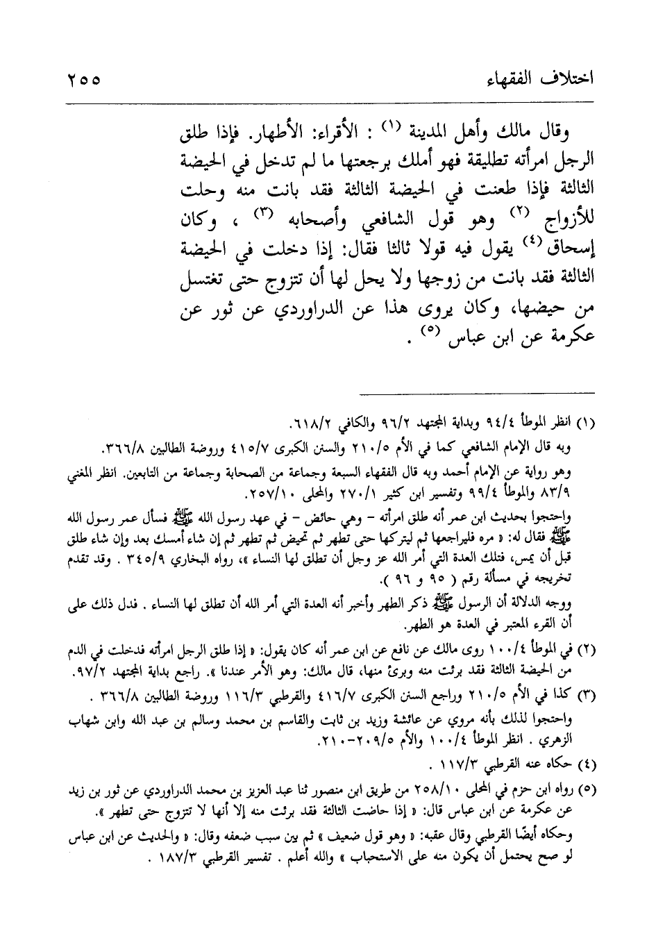 وَقَالَ مَالِكٌ وَأَهْلُ الْمَدِيْنَةِ: الأقراء: الأطهار. فَإِذَاطلق الرَّجُل امرأته تطليقة فَهُوَ أملك برجعتها ما لم تدخل فِي الحيضة الثالثة فَإِذَاطعنت فِي الحيضة فقد بانت منه وحلت للأزواج وَهُوَ قَوْل الشَّافِعِيّ وأَصْحَابه