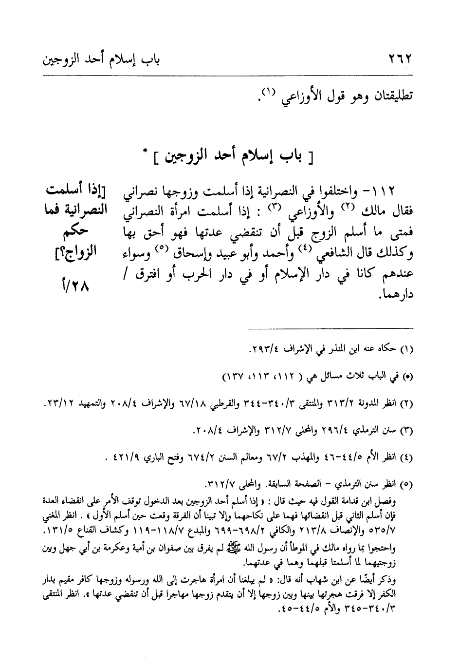 فقَالَ مَالِكٌ والْأَوْزَاعِيّ: إِذَا أسلمت امرأة النَّصْرَانِيّ فمَتَى ما أسلم الزوج قبل أن تنقضي عدتها فَهُوَ أحق بِهَا وكذَلِكَ قَالَ الشَّافِعِيُُّ وَأَحْمَدُ وأَبُوْعُبَيْدٍ وإِسْحَاق سواء عندهم كَانَ فِي دار الإسلام أَوْ فِي دار الحرب أَوْ افترق دارهما