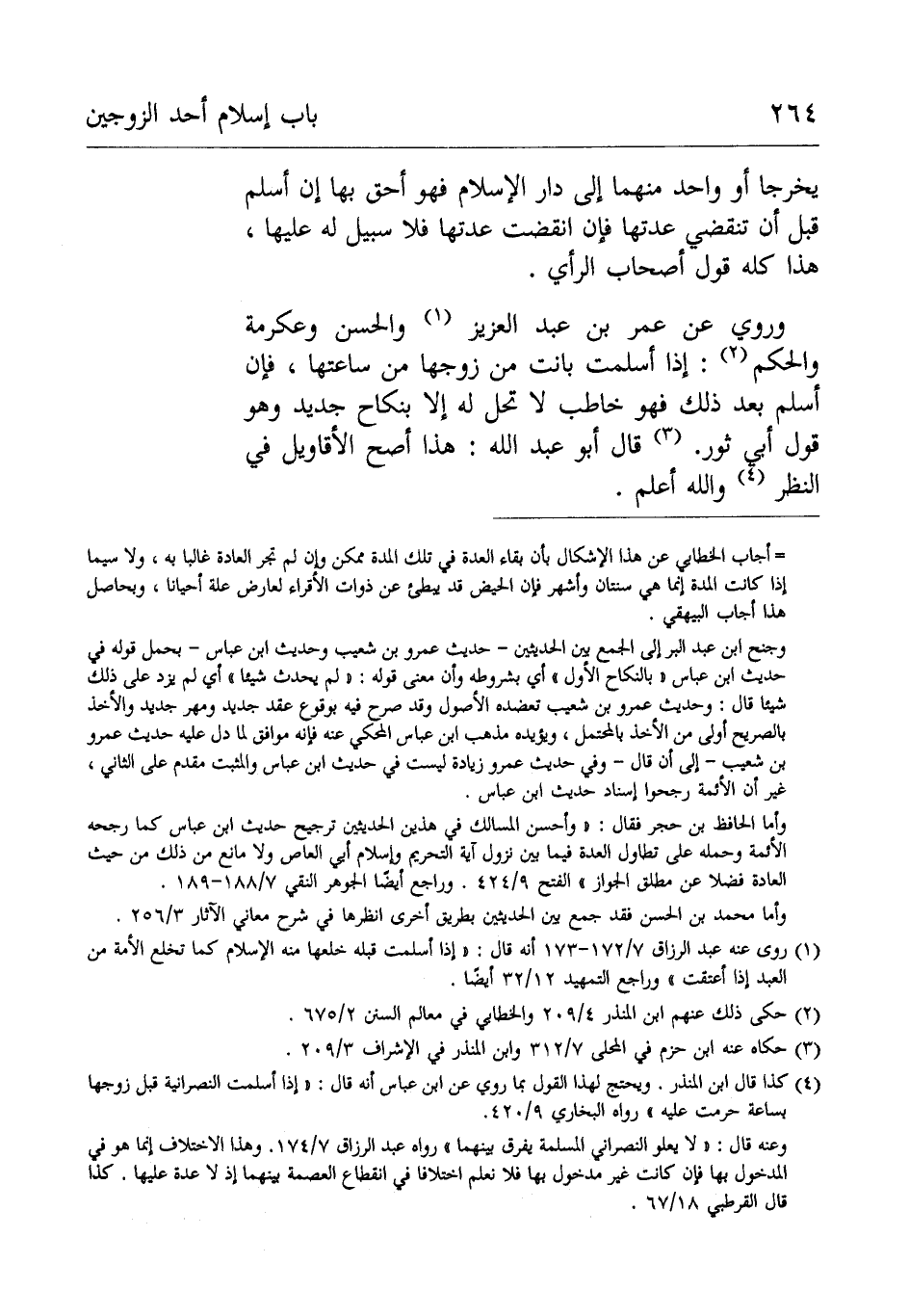 وروي عَن عُمَر بْن عَبْد الْعَزِيْزِ والْحَسَن وعكرمة والحكم: إِذَا أسلمت بانت من زوجها من ساعتها فإن أسلم بَعْد ذَلِكَ فَهُوَ خاطب لَا تحل له إِلَّا بنكاح جديد وَهُوَ قَوْل ثور