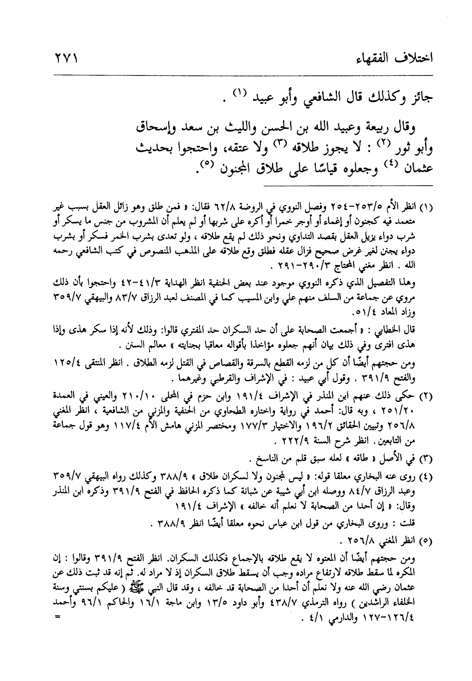 وَقَالَ ربيعة وعُبَيْد الله بْن الْحَسَن واللَّيْث بْن سعد وإِسْحَاق وأَبُوْثَوْرٍ: لَا يجوز طلاقه ولا عتقه؛ واحتجوا بحَدِيْث عثمان وجعلوه قياسا عَلَى طلاق المجنون