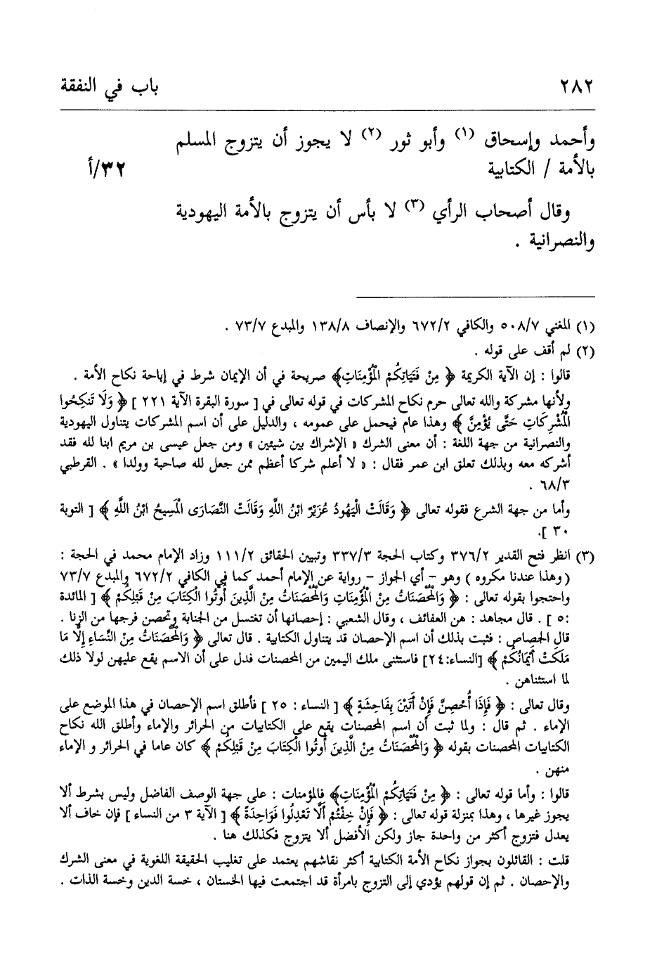 وأَحْمَد وإِسْحَاق وأَبُوْثَوْرٍ: لَا يجوز أن يتزوج المسلم بالأمة [32/أ] الْكِتَابية.