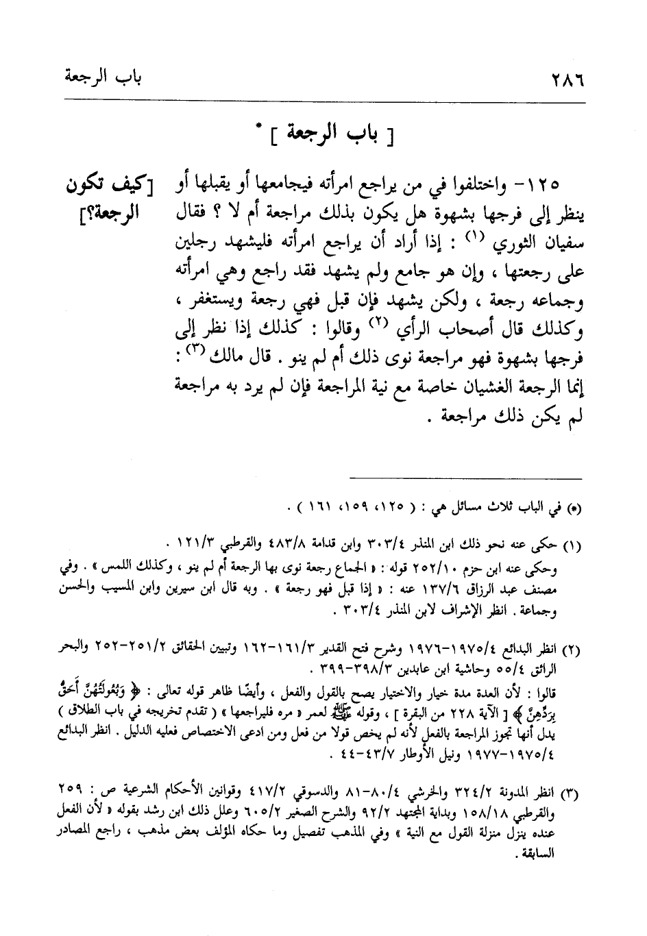 125- واخْتَلَفُوْا فيمن يراجع امرأته فيجامعها أَوْ يقبلها أَوْ ينظر عَلَى فرجها لشهوة هل يكون بذَلِكَ مراجعة أم لا؟