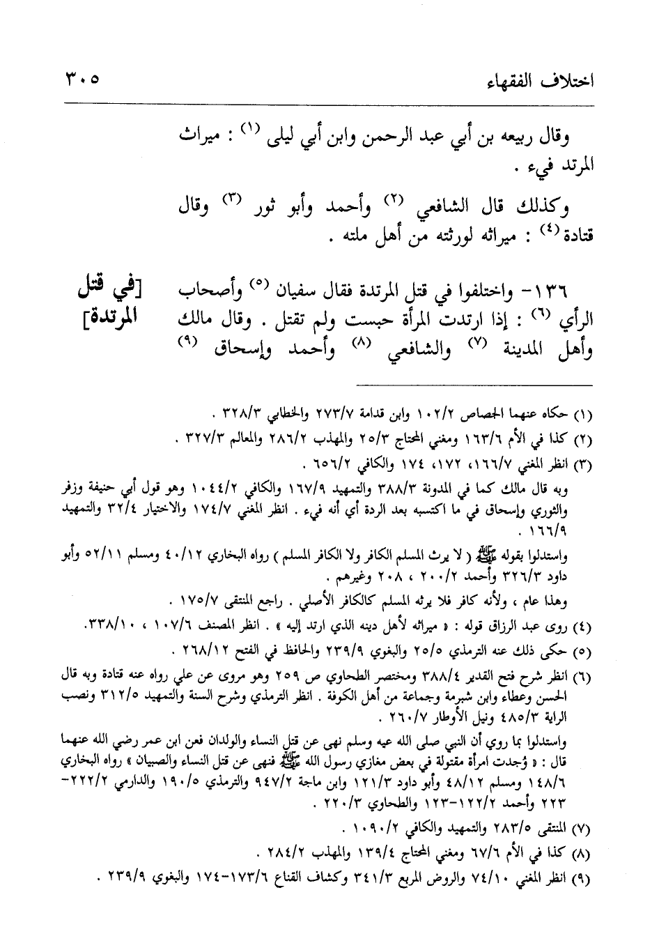 136- واخْتَلَفُوْا فِي قتل المرتدة إِذَا ارتدت عَن الإسلام فقَالَ سُفْيَانُ وأَصْحَاب الرَّأْيِ: إِذَا ارتدت الْمَرْأَة حبست ولم تقتل