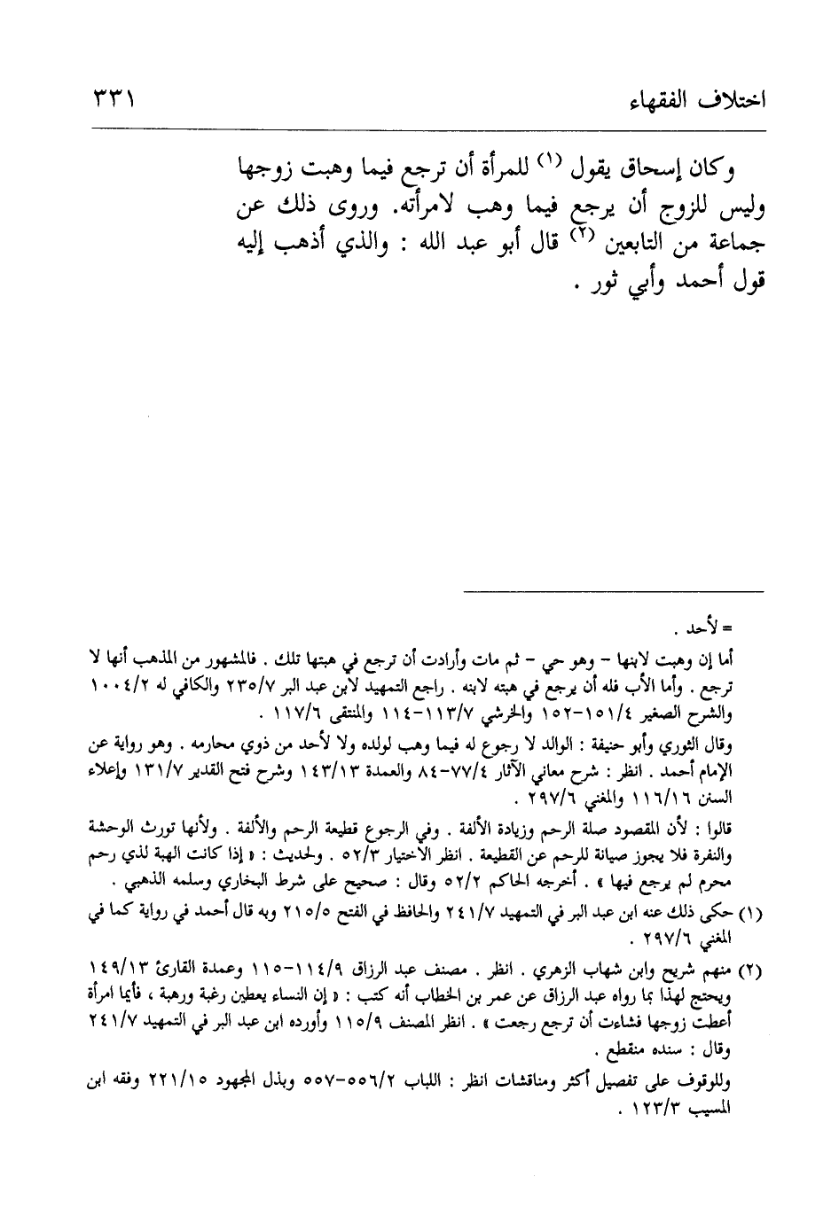 وكَانَ إِسْحَاق يَقُوْلُ: للمرأة أن ترجع فيما وهبت زوجها ولَيْسَ للزوج أن يرجع فيما وهب لامرأته.